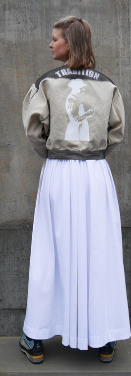 VON DER UNIFORM ZUM SKELETT. KRIEG TÖTET. INSPIRIERT VON DEN SCHRECKEN DES 2. WELTKRIEGES ENTSTAND EINE DÜSTERE KOLLEKTION, WELCHE ROH UND BRUTAL WIRKT, WIE AUCH SEHR FEIN UND ZERBRECHLICHE FACETTEN AUFWEIST. ES GEHT UM DAS THEMA SCHUTZ UND VERHÜLLUNG, WELCHES DIE MENSCHEIT SCHON IMMER BESCHÄFTIGT. DIE FARBEN ZWISCHEN PECHSCHWARZ UND NEBELWEISS SIND DER UMWELT ANGEPASST UND TARNEND.